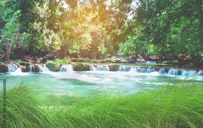 Green grass frame and Small Waterfall in autumn forest at National Park.