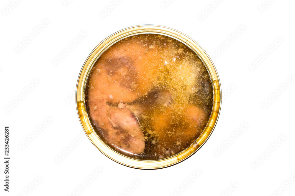 Tuna in a tin on a white background.Canned fish.Tin of fish.
