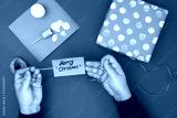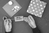 The original design of a Christmas gift of craft paper, white paint, a stamp of potatoes. Step by step on the photo. Handmade, DIY. A gift wrapped in brown paper with white polka dots.