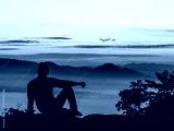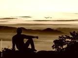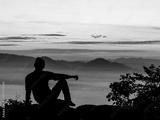 Young man sitting on mountain watching the sunrise at winter morning. Thinking and relaxing concept.