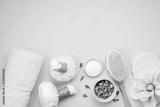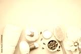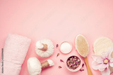 Feminine beauty and spa products, tools and cosmetics over the pink background