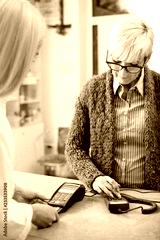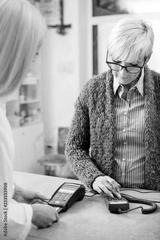 Mature female patient buying medications in a pharmacy, paying with credit card and typing security code. Medicine, pharmaceutics, health care and people concept