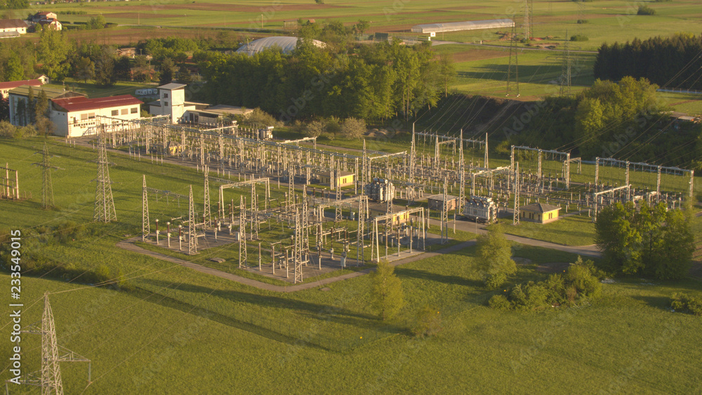 AERIAL: High voltage power line towers and electricity power plant in suburbs