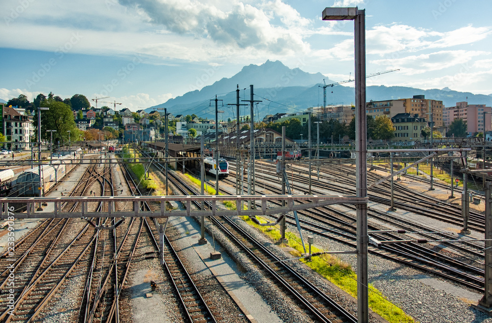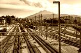 Dworzec na tle gór, z pociągiem, tory, trakcja