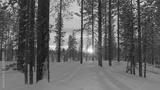 AERIAL CLOSE UP: Flying past snowy pine trees in winter forest at golden sunset