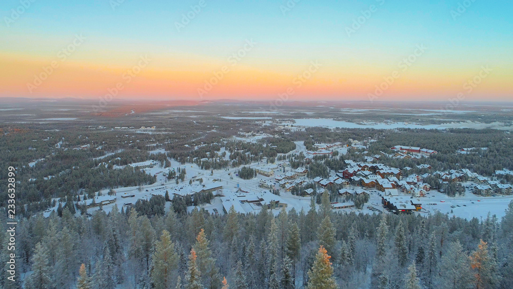 AERIAL CLOSE UP Flying over frozen pine trees, revealing Levi ski resort Finland