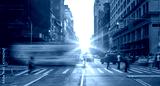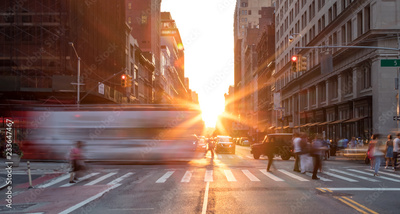 Busy New York City street scene with crowds of people in Midtown Manhattan with sunset background