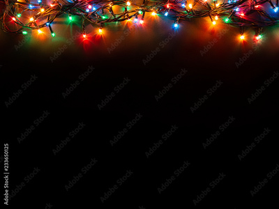 Christmas background with lights and free text space. Christmas lights border. Glowing colorful Christmas lights on black background. New Year. Christmas. Decor. Garland.