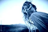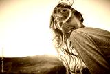 portrait of smiling cheerful woman with long hair sitting on edge of cliff against background of sunrise. woman's hair fluttering beautifully in the wind