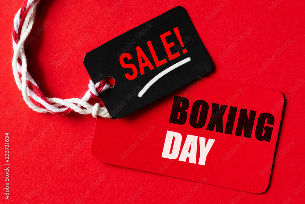 Boxing day Sale text on a red and black tag. Shopping concept.