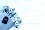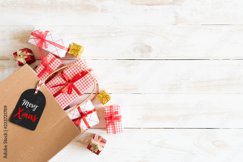 Christmas and New Year's composition. Top view of Gift box and brown shopping bag with message tag on a wooden white background.