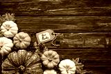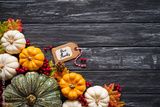 Top view of Autumn maple leaves with Pumpkin and red berries on old wooden background. Thanksgiving day concept.