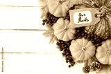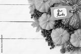 Top view of Autumn maple leaves with Pumpkin and red berries on white wooden background. Thanksgiving day concept.