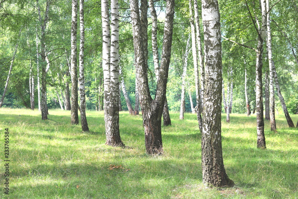 Beautiful birch trees with white birch bark in birch grove with green birch leaves