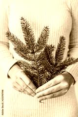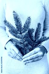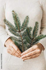 Fir branch in female hand. Winter / New Year / Christmas concept.