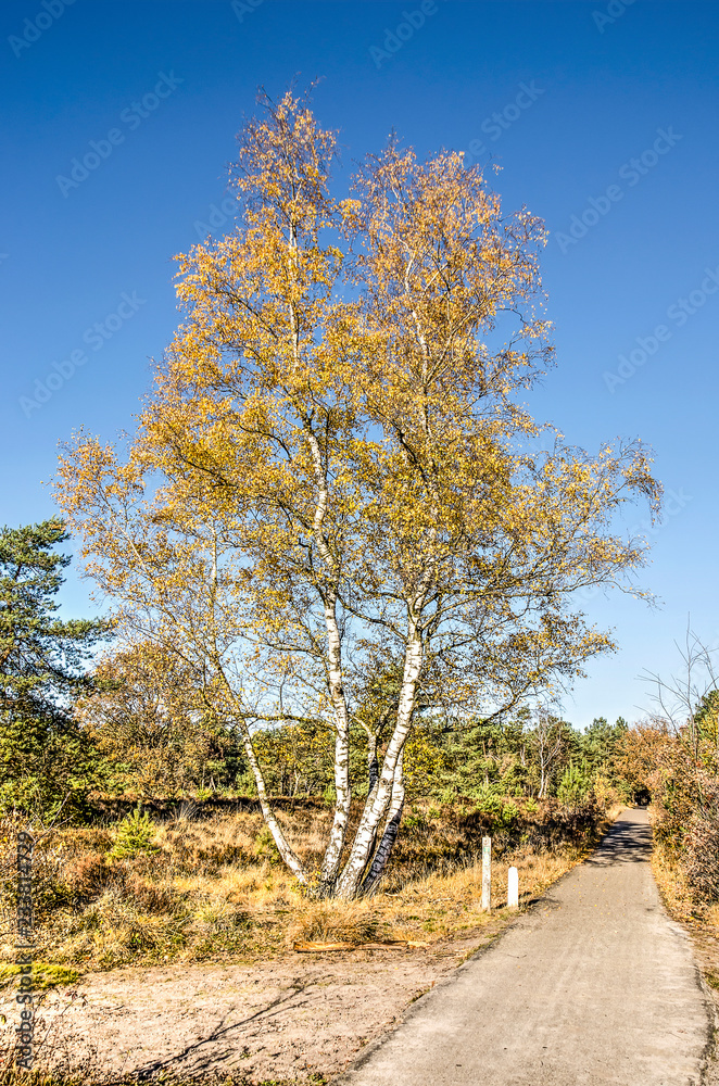 Birch tree with multiple trunks next to a bicycle path through a heathfield near Zundert, The Netherlands