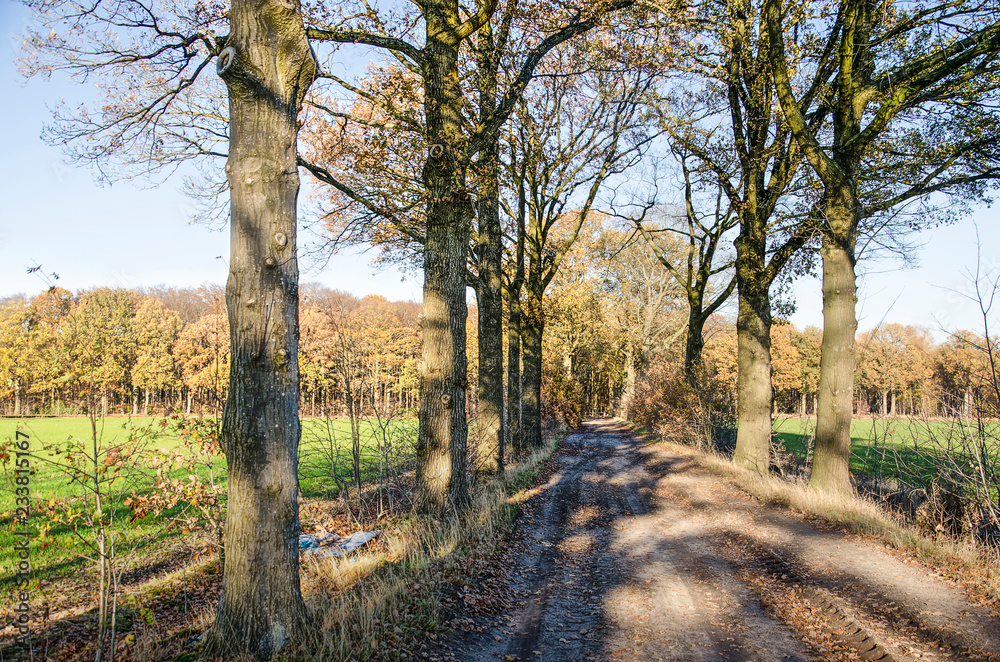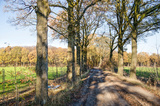 Dirt road near Zundert, The Netherlands with meadows on both sides and the edge of a forest in the background on a sunny day in november