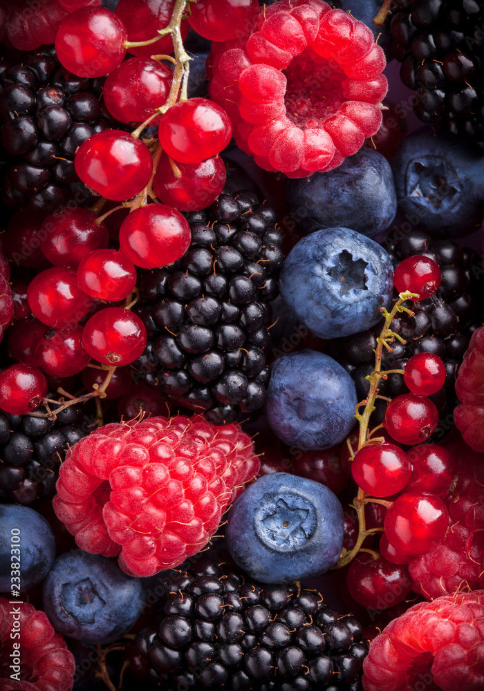 Berries fresh shiny colorful overhead mix arrangement blackberries red currant raspberries close up in studio
