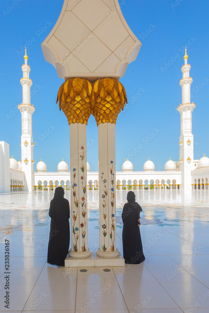 Women wearing traditional Abaya praying during Ramadan celebration in Sheikh Zayed Grand Mosque in Abu Dhabi