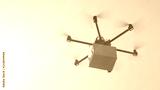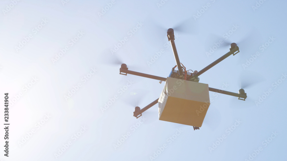 CLOSEUP LENS FLARE Drone delivery, aircraft flying brown package cargo over sun