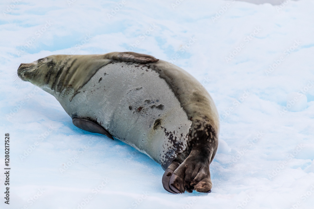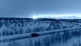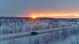 AERIAL: Car driving on snowy highway through scenic winter country at sunset