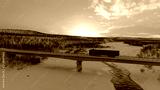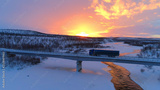 AERIAL: Semi truck crossing the bridge above icy river in the winter at sunset