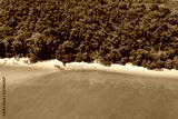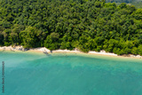 Aerial drone view of an empty tropical sandy beacj surrounded by lush green forest