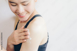 Portrait of young Asian woman applying sunscreen lotion on her body for protect her skin.