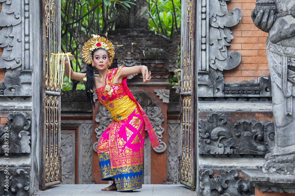 Woman dancing pendet dance on temple door