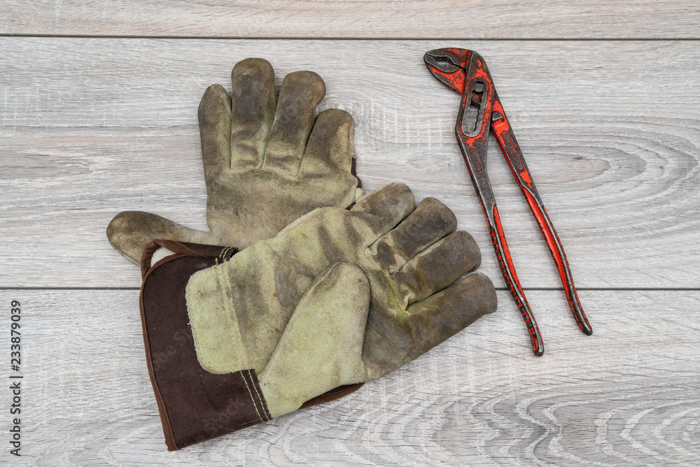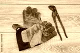 a parrot key and a pair of work gloves on a wooden table