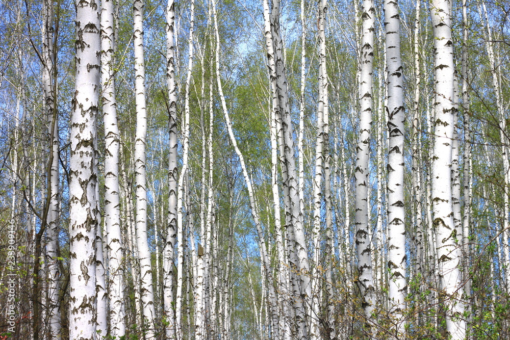 Young birch with black and white birch bark in spring in birch grove against the background of other birches