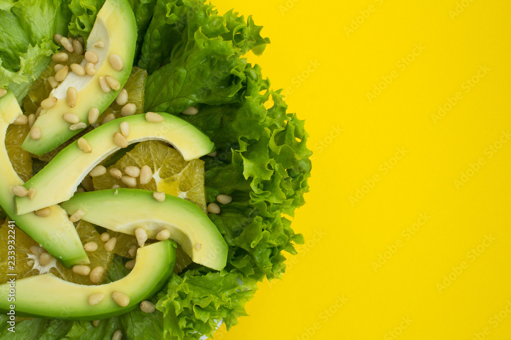 Vegetarian salad with avocado, lettuce leaves, orange and pine nuts on the yellow background.Top view.Copy space.