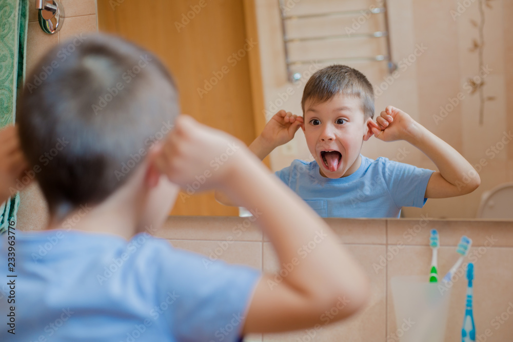 The child grimaces before the mirror in the bathroom. A little boy shows his tongue and has fun.
