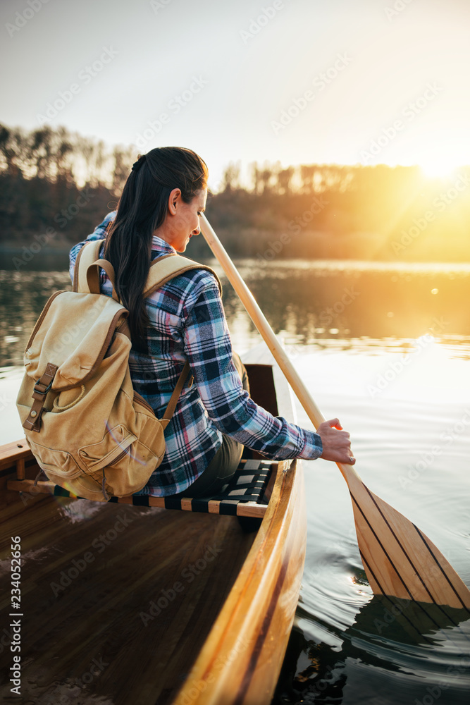 Side view of travel girl paddling canoe on the sunset lake