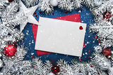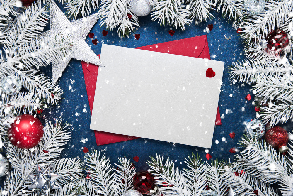 Merry Christmas and Happy Holidays greeting card, frame, banner. New Year. Noel. Silver, white and red Christmas ornaments and fir tree on blue background top view. Winter holiday xmas theme. Envelope