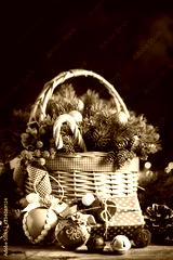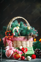 Merry Christmas and happy new year. Basket with Christmas toys and Christmas gifts on a wooden background.