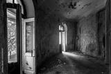 Concept of the modern loft. Abandoned room in an abandoned house. Blue wall yellow window. Work of the designer