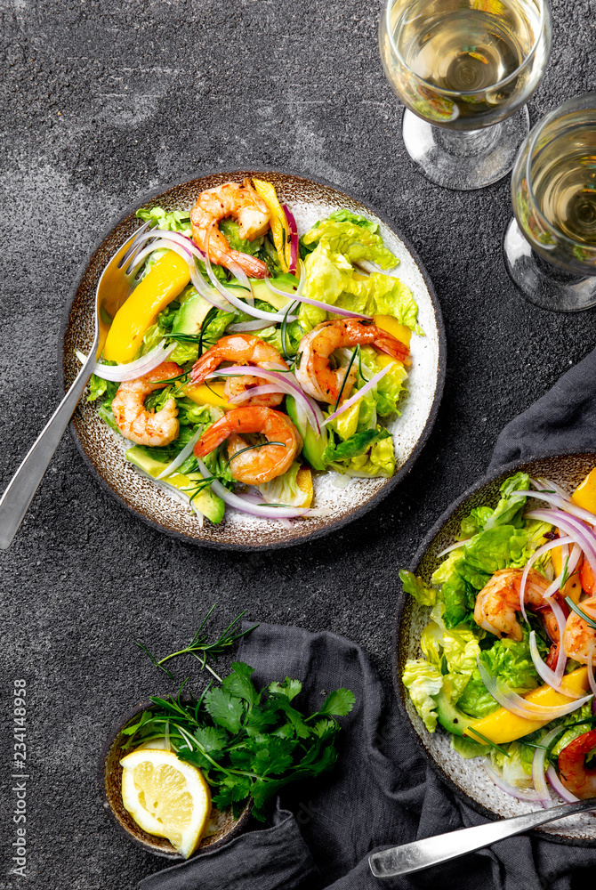 Fresh Shrimps, Mango Avocado lettuce salad, olive oil and lemon dressing. healthy food. Top view, gray background
