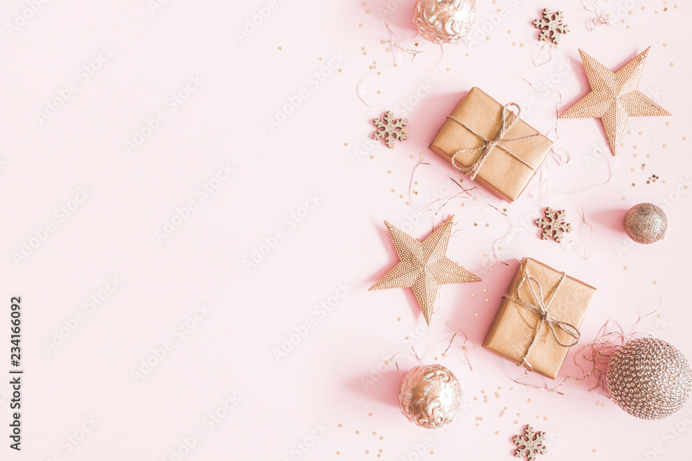 Christmas composition. Christmas gifts, golden decorations on pastel pink background. Flat lay, top view, copy space
