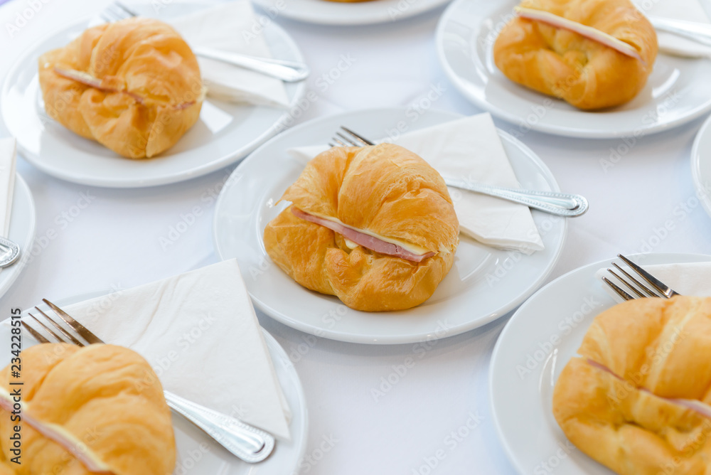 More fresh croissant sandwich with ham and cheese on white plate. tea time and coffee break at conference meeting business