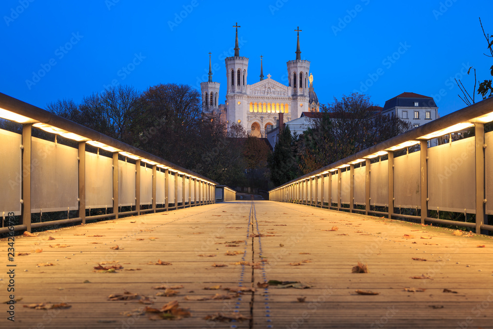 Illuminated footbridge toward basilique Notre-Dame de Fourviere on an autumn evening. Lyon, France.