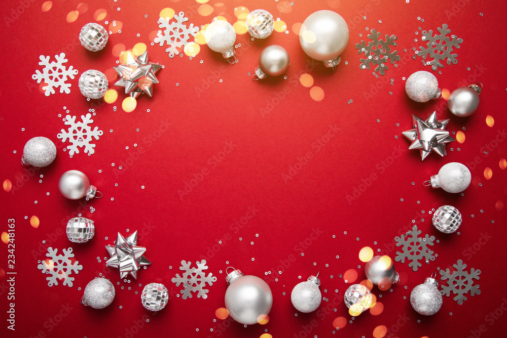 Merry Christmas and Happy Holidays greeting card, frame, banner. New Year. Noel. Christmas white and silver ornaments on red background top view. Winter holiday xmas theme.