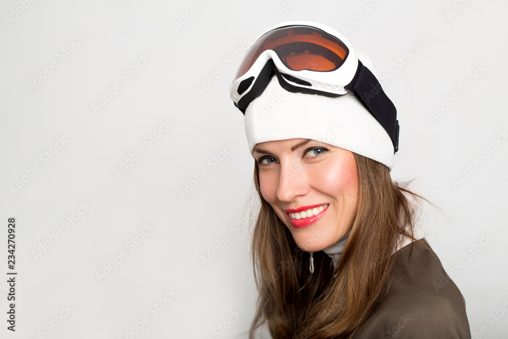 Ski woman wearing sports winter clothing and goggles isolated over white