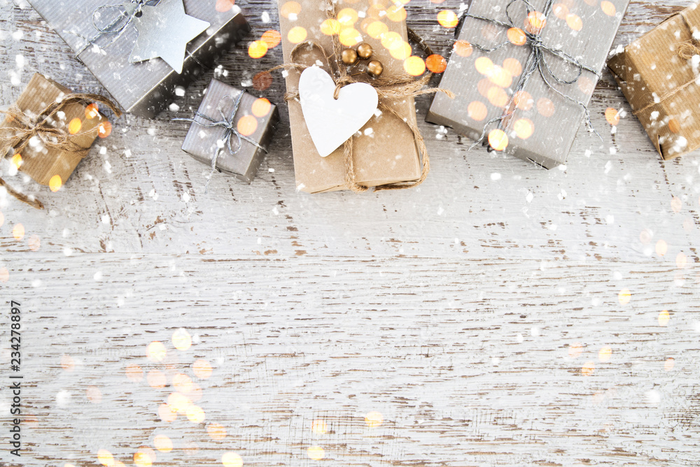 Christmas and New Year holiday background. Xmas greeting card. Christmas gifts on white wooden background top view. Flat lay