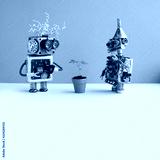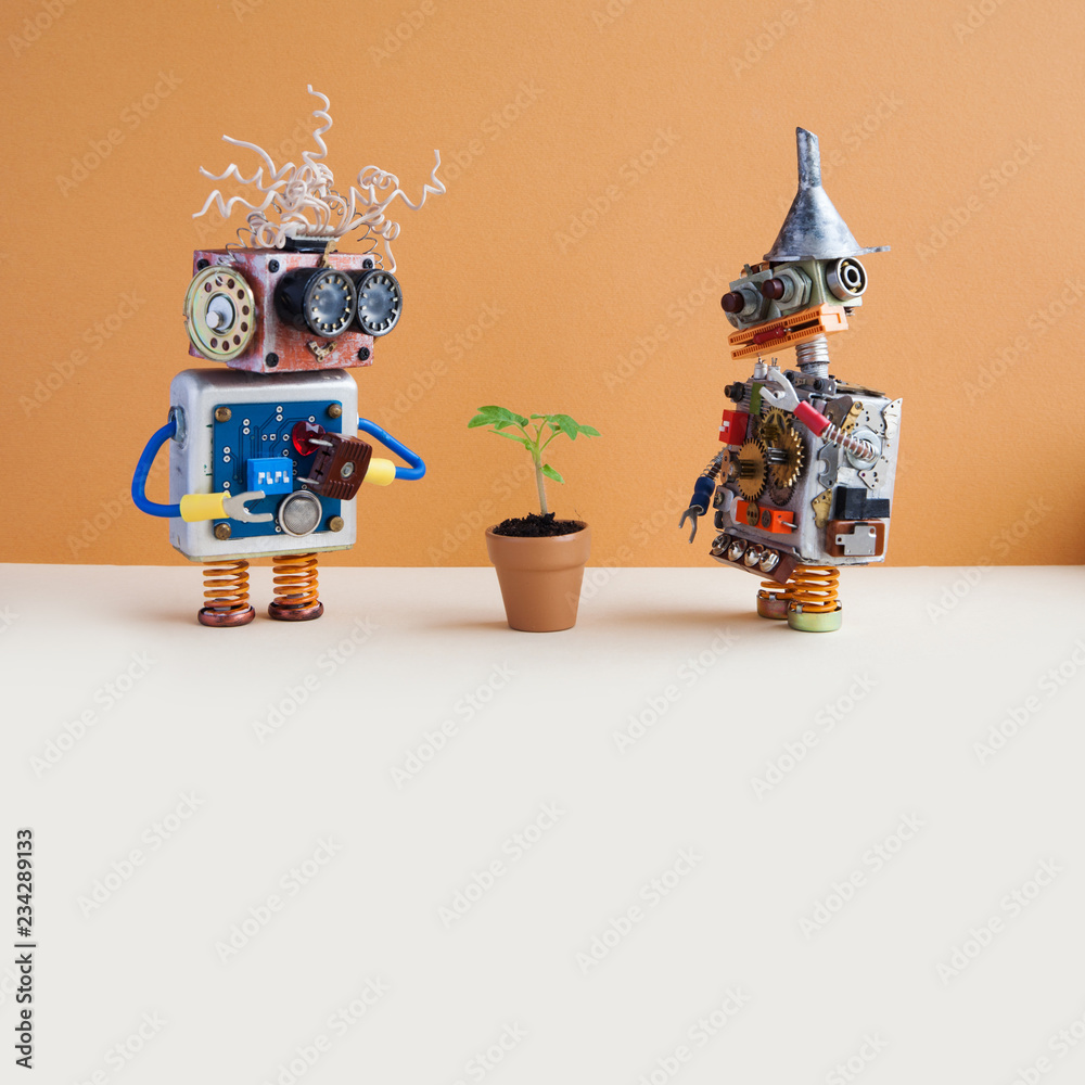 Two robots and flowerpot. Creative design robotic characters looks at the green plant housepot . Brown wall background, copy space beige floor