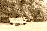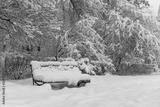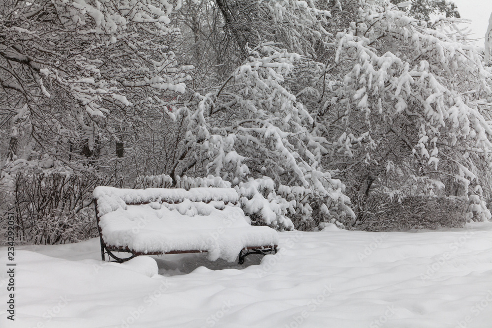 Snow covered bench, cold weather concept. Snowfall winter park landscape.