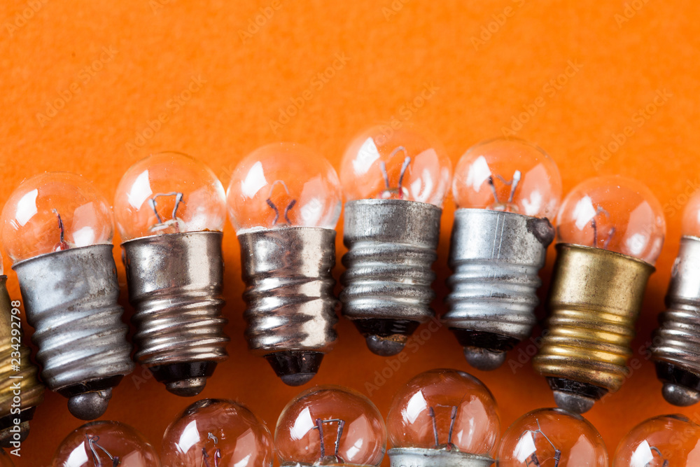 Vintage lamps macro view. Light bulbs with textured gold bronze and silver surface. Orange background, macro view shallow depth of field photo