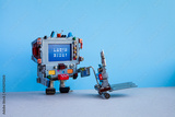 Robotic courier computer and message Lets Ride. Delivery service automation logistic concept. Robot moving pushcart mechanism. Blue wall, gray floor background. copy space.
