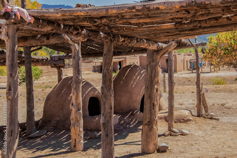 Two hornos-traditional earthen ovens- underneath a drying rack with a childs doll left on the corner - Homes of the Ute Pueblo in Taos New Mexico in the background - shallow focu