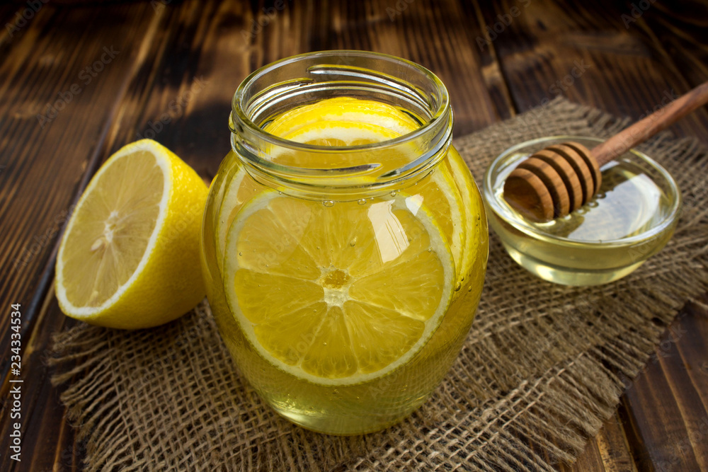 Honey with lemon in the glass jar on the rustic wooden background